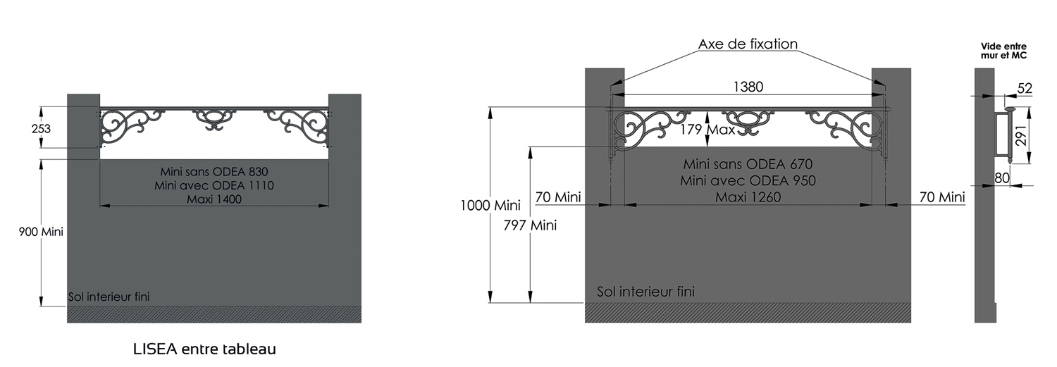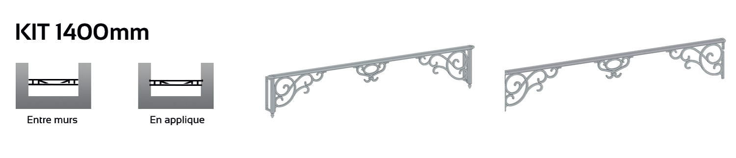 Fixations : Entre tableau ou en applique (le motif central disparait si la largeur tableau est inférieure à 1110mm entre tableau et à 950mm en applique).