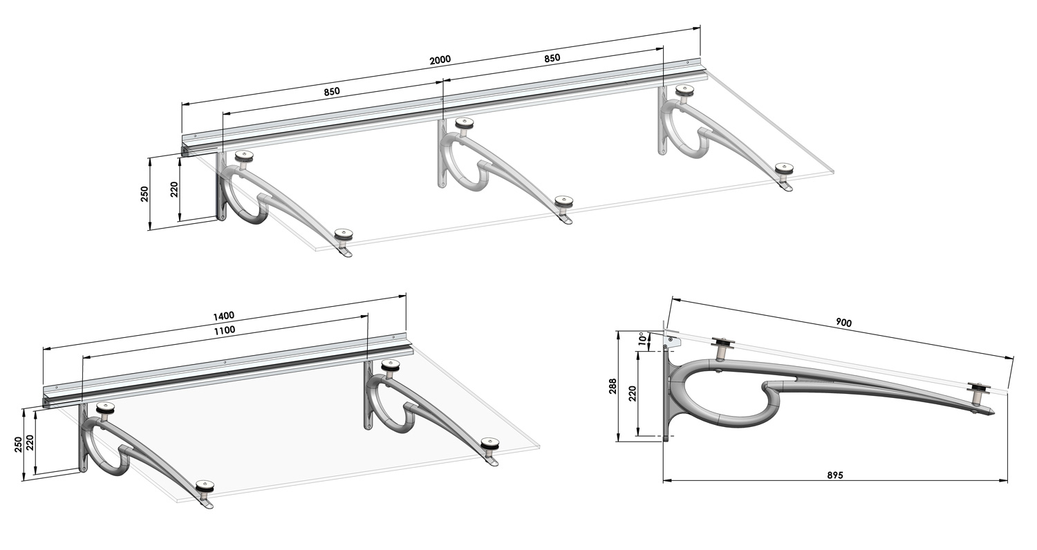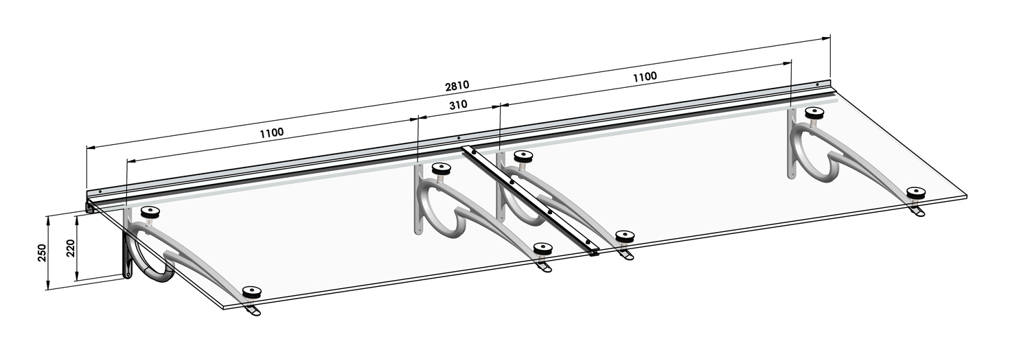 Marquise composée de deux ou trois motifs latéraux et d’un verre feuilleté trempé 55.2 clair.